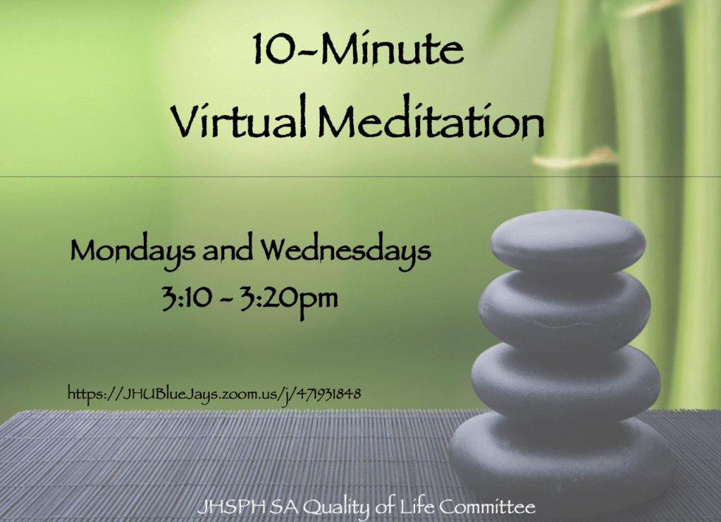 Mindfulness meditation can be an excellent resource to manage stress and anxiety during uncertain times. Dr. Neda Gould, faculty member in the Department of Psychiatry and Behavioral Sciences and Director of the Mindfulness Program, will be leading daily meditations at 8 AM, 12 PM and 5 PM open to the entire Johns Hopkins Community. Sessions will be 30 min in length and will include a variety of mindfulness meditation practices in a virtual format. Open the following zoom link at the scheduled times to join. https://jhjhm.zoom.us/j/747490420 Meeting ID: 747 490 420