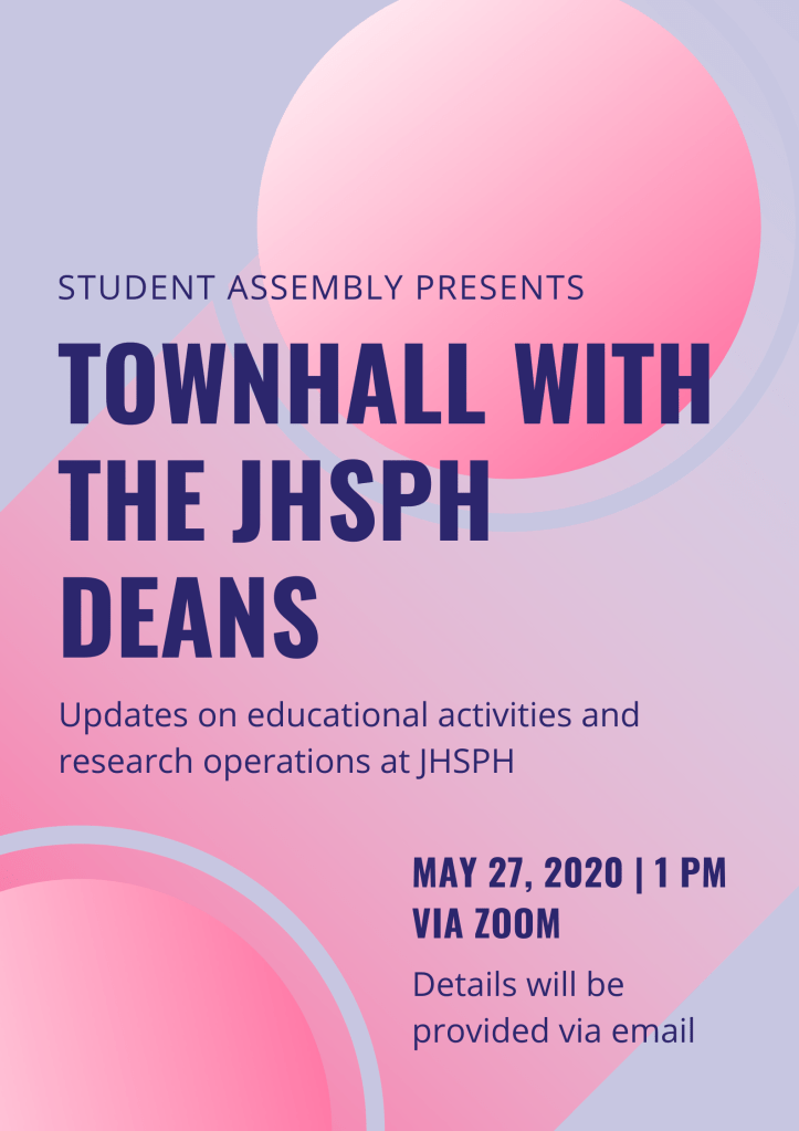 Student Assembly is happy to announce a School-wide Town Hall with the Deans to discuss updates on educational activities and research operations at JHSPH. Event details sent via email.