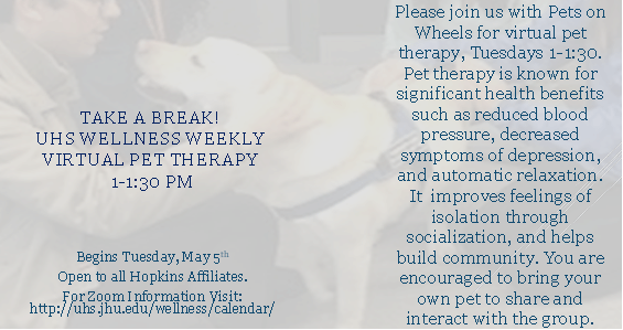 UHS Wellness will host weekly virtual pet therapy sessions with Pets. You will have the opportunity to meet each pet and their owners, learn a little about them, ask questions, and see a trick or two!